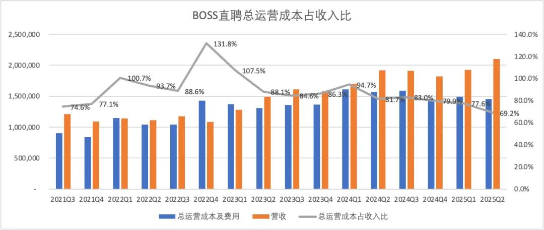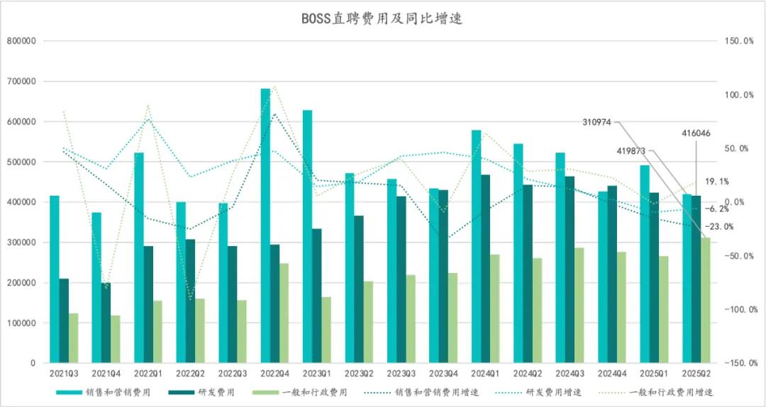 以2025年第二季度為例,BOSS直聘營收21.02億元,營業成本、銷售和營銷費用、研發費用、一般和行政費用僅為14.54億元。直接結果加上利息和投資收入,扣減外匯、税務等常規項之後,淨利潤來到7.1億元。