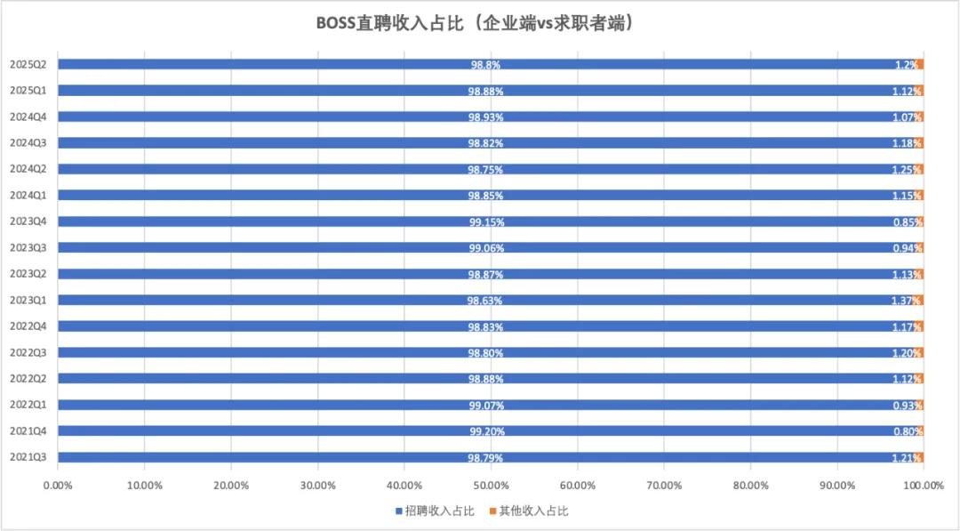 BOSS直聘2025年第二季度收入中,有99%來自於企業端。這一比例自2021年公司上市有財報可追溯起就維持至今。來自求職者的收入忽略不計。