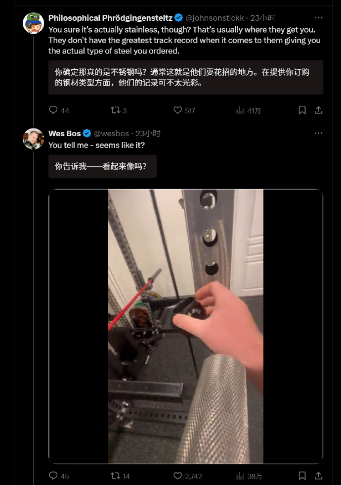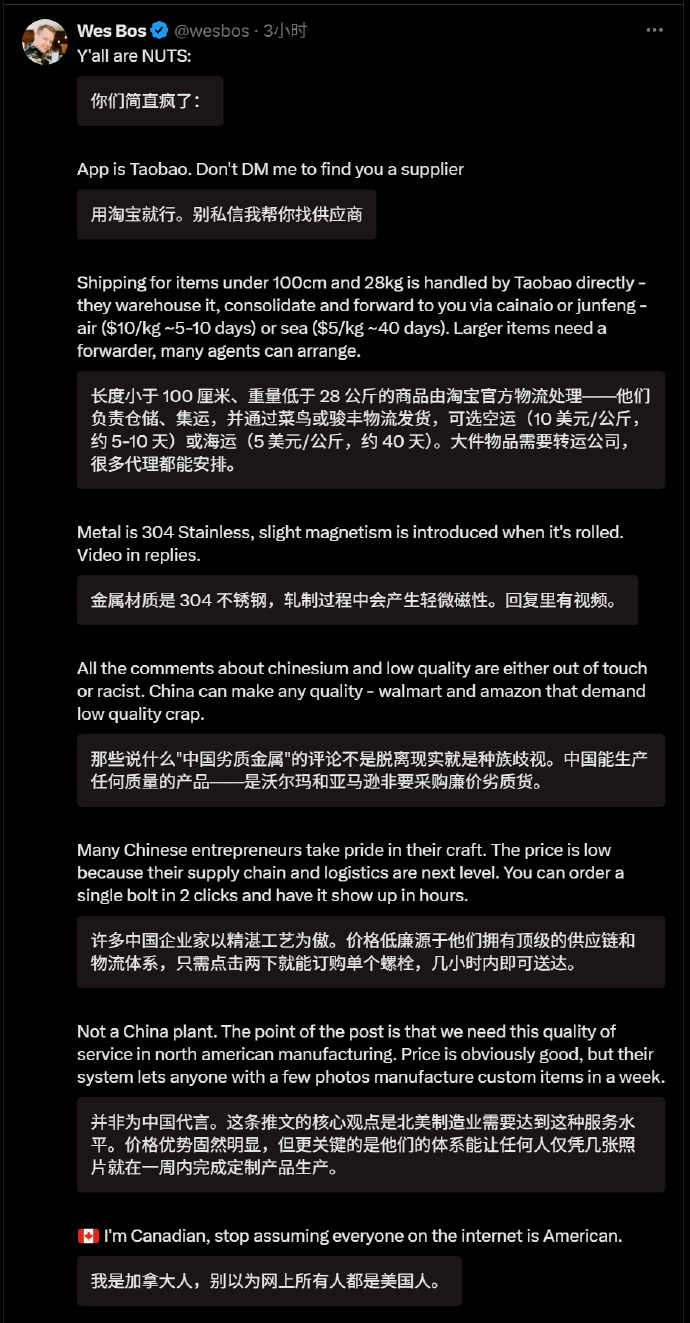 🔻所以,帖子下面很多美國人在問:“怎麼才能找到中國的機械加工師傅?”、“有推薦的人選嗎?”、“你是怎麼聯繫上這個人的?我也想這麼幹”、“能給我他的聯繫方式嗎?我想做個尺寸差不多的東西,但用途不同”、“你是怎麼聯繫到這些廠家的?是通過阿里巴巴嗎?”、“那段對話是在哪個應用裏進行的?”、“如何找到/聯繫機械加工師來開始合作?對於運輸輕質但尺寸較大的非標準形狀物品,有什麼建議嗎?想知道這樣是否會失去成本效益”、“沒有最低起訂量嗎?”