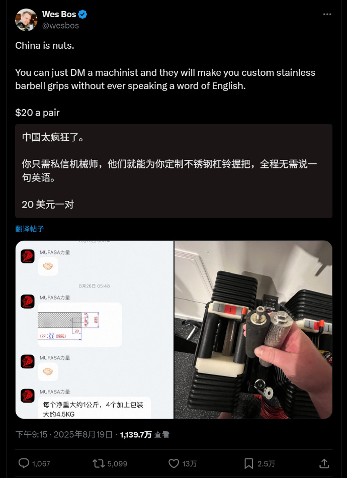🔹“去年我就這麼幹過。花 15 美元定製了滾花握把。中國的製造業效率真是頂尖水平”;