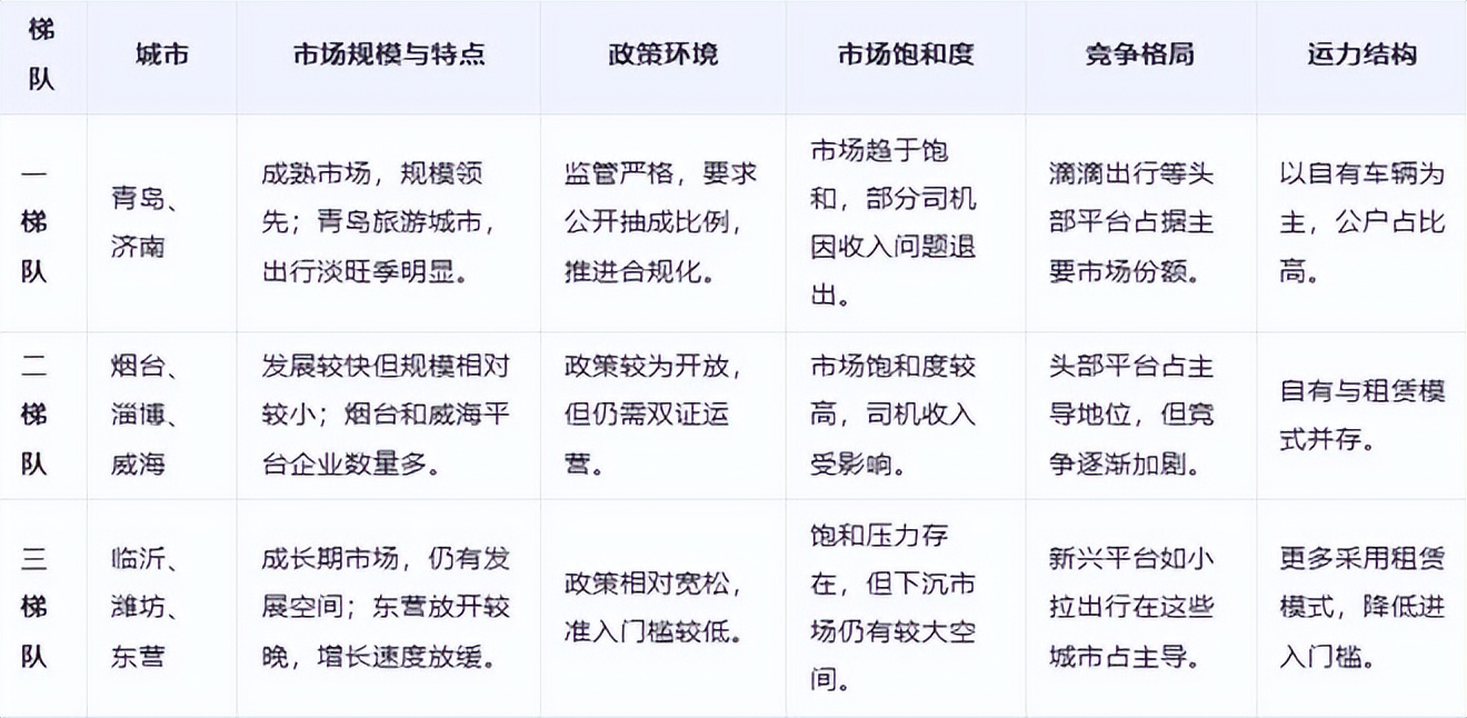 **第三,競爭格局不同。**青島、濟南等核心城市平台競爭激烈,滴滴出行等頭部平台佔據主要市場份額。而三四線城市則由新興平台如小拉出行主導,小拉出行已覆蓋山東省22個城市,成為下沉市場的重要參與者。