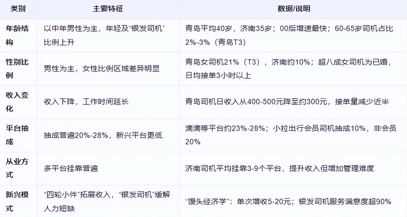 此外,山東省內部分城市開始嘗試**“銀髮司機”**計劃,為60歲以上老年人提供就業機會。青島T3出行60-65歲司機佔比約2%-3%,但服務滿意度高達90%以上。這種模式既解決了老年人再就業問題,也緩解了網約車行業司機短缺的壓力。