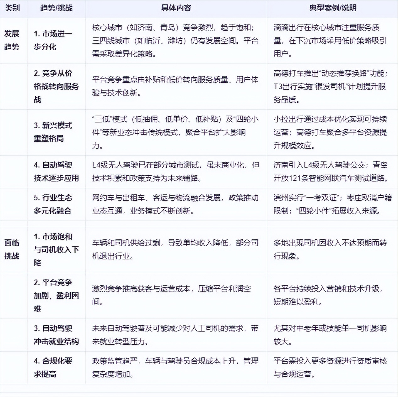 然而,山東省網約車市場也面臨多重挑戰。市場飽和導致司機收入下降,部分司機因收入不達預期而選擇退出行業。同時,平台間競爭加劇導致運營成本上升,盈利空間進一步縮小。此外,自動駕駛技術的應用將帶來就業結構的變革,可能影響傳統司機的就業機會。最後,合規化要求提高也增加了平台的運營成本和管理難度,對平台的長期發展構成挑戰。