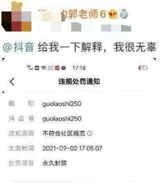 但是好景不長,2021 年 9 月的時候,郭老師的賬號突然被短視頻平台永久封禁,相關話題還一度衝上熱搜榜。