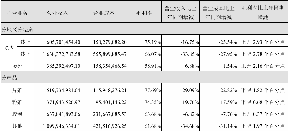 從產品結構來看,湯臣倍健各劑型產品均出現不同程度的下滑。經銷模式下,片劑、粉劑、膠囊、其他(主要為禮盒)營業收入分別同比下滑29.09%、19.76%、6.82%和34.68%。直營模式下,片劑、粉劑、其他產品分別下滑25.95%、4.47%和42.20%,只有膠囊產品實現17.20%的增長。