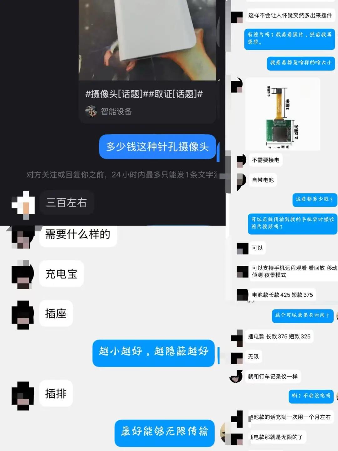 其中一位博主,在小紅書筆記中展示一款造型類似充電寶的設備,實際私信後,對方引導用户添加QQ,隨即展示產品説明:攝像頭鏡頭僅1毫米,支持手機遠程觀看、錄像回放、移動偵測與夜景模式。產品按照功能不同分為兩類:電池款分別售375元與325元,插電款則無需充電,稱“有電就能一直拍”。全部設備隱蔽性極強,外觀與普通家電無異。對方強調“看不到鏡頭”“根本發現不了”