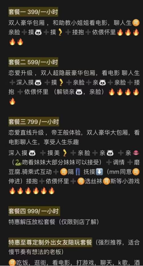 調查發現,小紅書中推薦頁面中隨機選擇一位正在發佈私影招聘的帖子,私信後被博主導流至微信進行私聊。這家店私影店於武漢,當詢問工作內容都是什麼時,店主的直接發來價格表:套餐一399元/小時,內容為親臉、摸胸、摟抱;套餐二599元,加入親胸、撫摸腿部等;套餐三799元,包含舌吻與“磨豆腐式騎乘”,可隔着褲子摸私密部位;套餐四則為999元/小時,提供“打飛機”服務。如女生願意,還可外出,價格另計,店家與女孩按五五分賬。