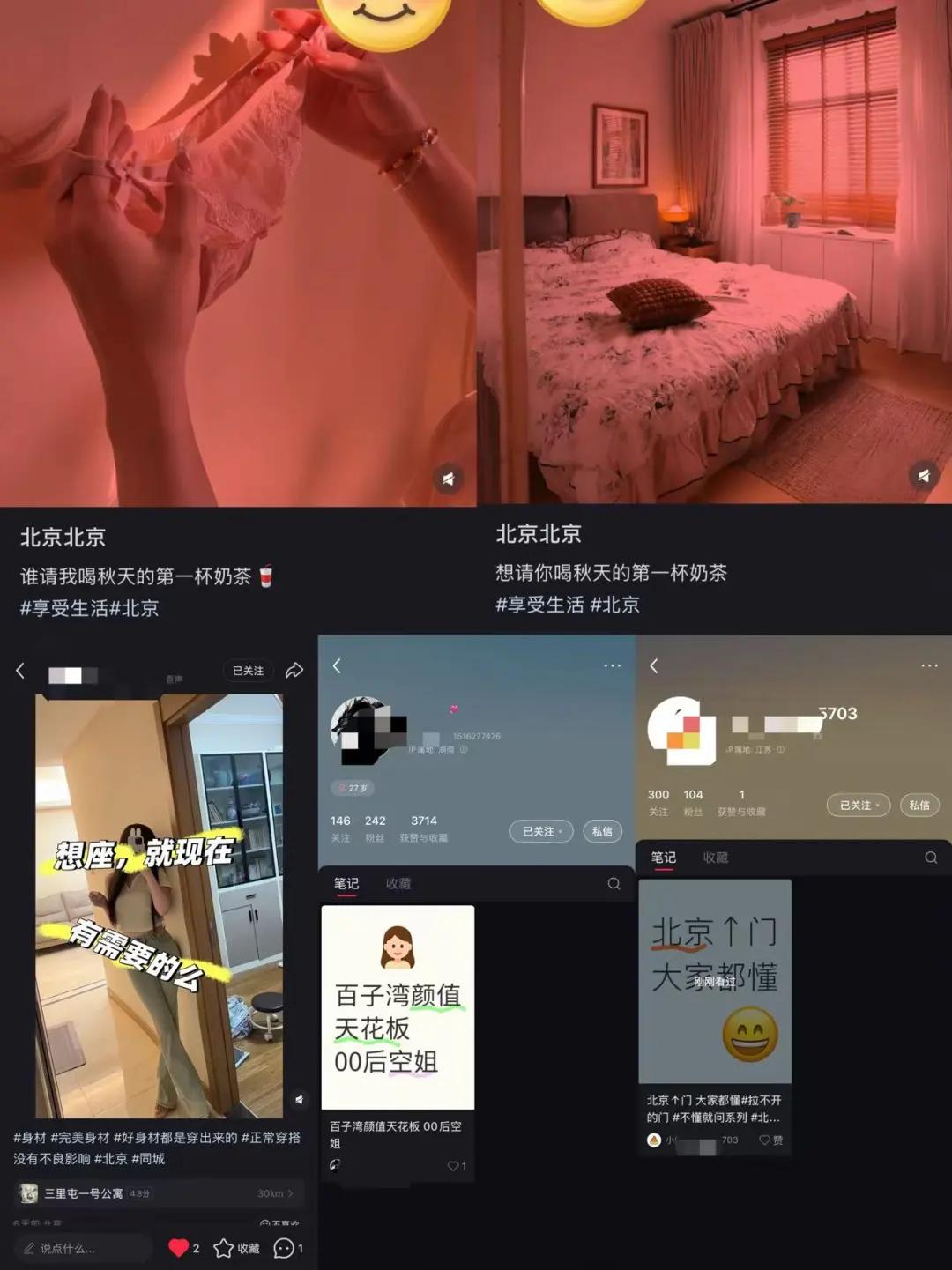 第三種路徑則更為直接。一些賬號發佈看似“生活分享”式的自拍照,配圖模糊不清或者標註上門等詞彙,構圖曖昧,文字內容多使用具有挑逗意味的情緒性語言作為誘餌。