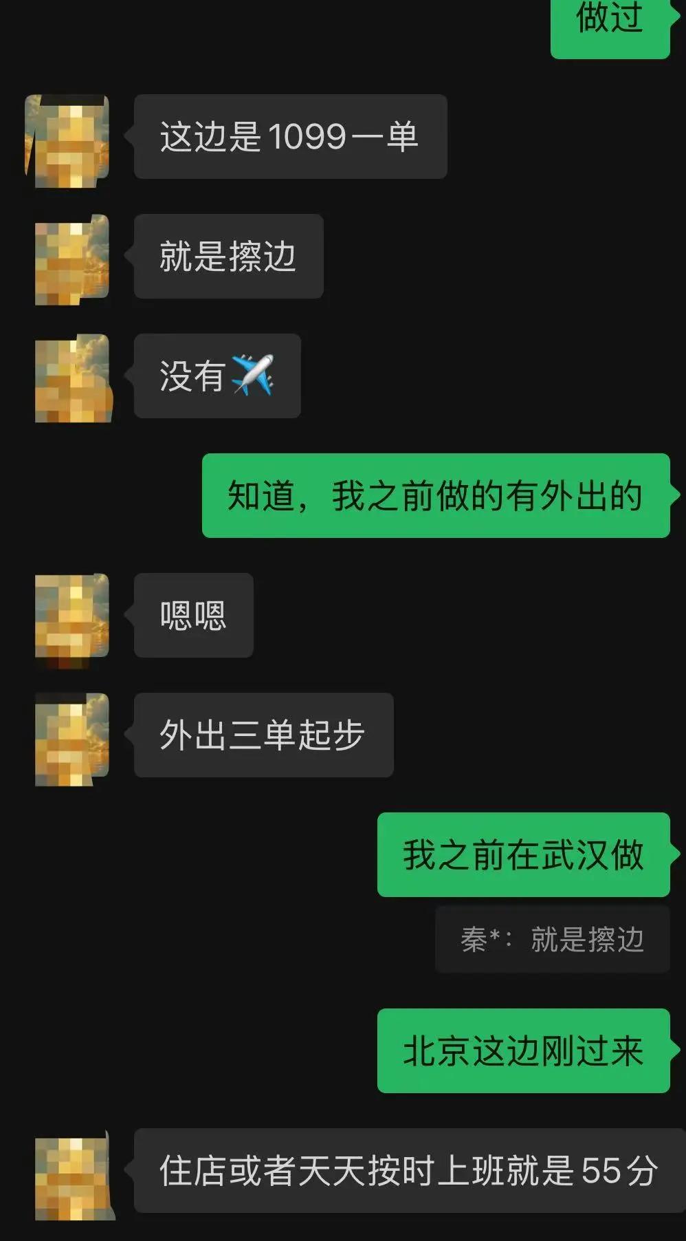 通過小紅書推薦的帖子聯繫上的另一位來自北京的私影店主則更具“職業感”。在價格上,他開出1099元一單,並主動説明:“北京查得嚴,我們只擦邊,沒有打飛機。”語氣收斂,規則清晰,交易方式與武漢店主如出一轍,分賬仍是五五分。她強調,來應聘的女孩只要“做過這一行的都懂”,暗示行業在平台內已有默認“潛規則”。