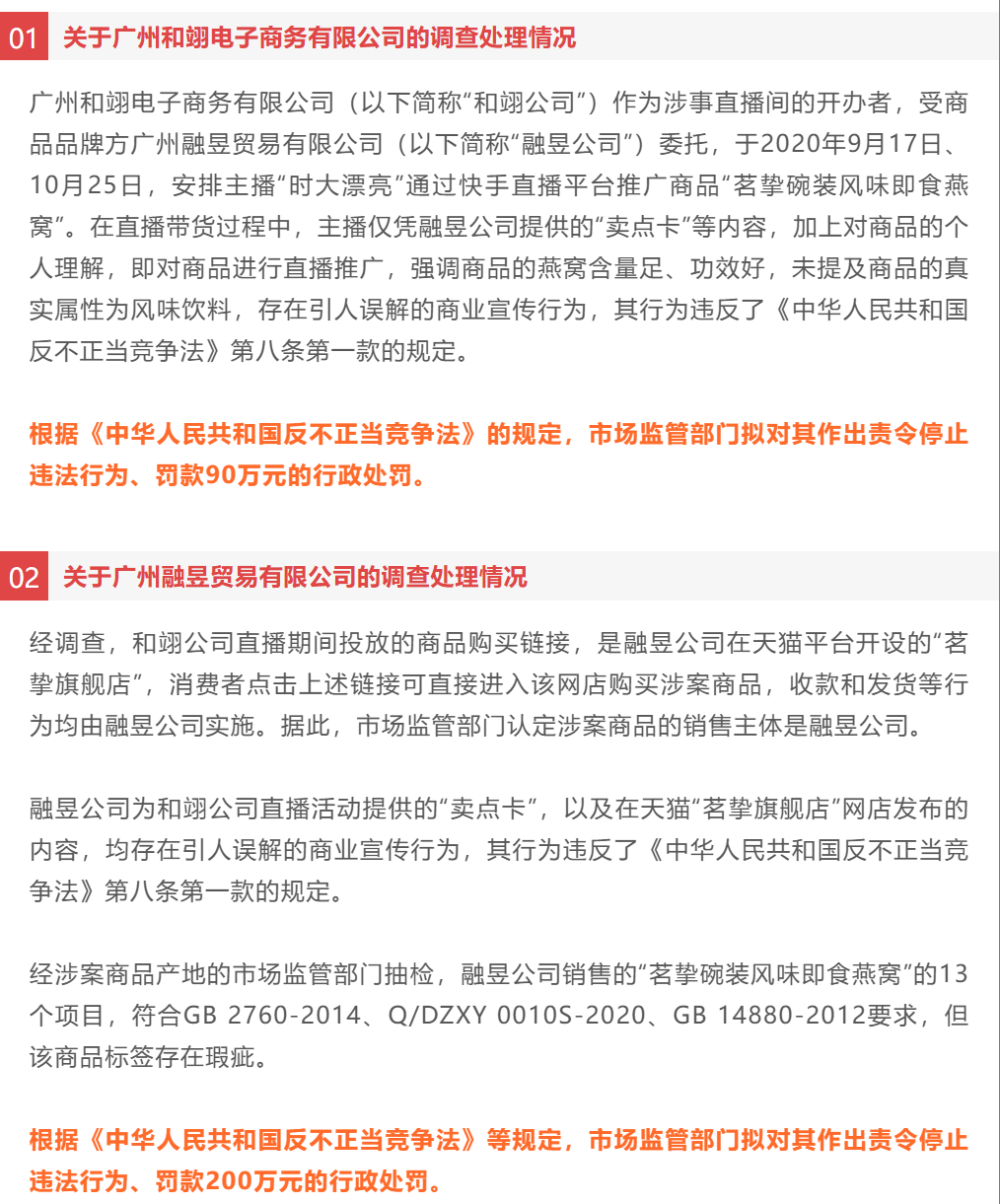 當年12月23日,廣州市場監管部門公佈“辛巴直播帶貨即食燕窩”調查處理情況:辛巴方被罰90萬,品牌方被責令停止違法行為、罰款200萬元。