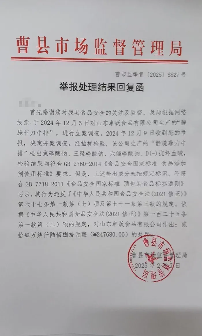 對此,山東曹縣市場監管局以“未按規定標識食品添加劑”為由對涉事生產商罰款24.7萬元。