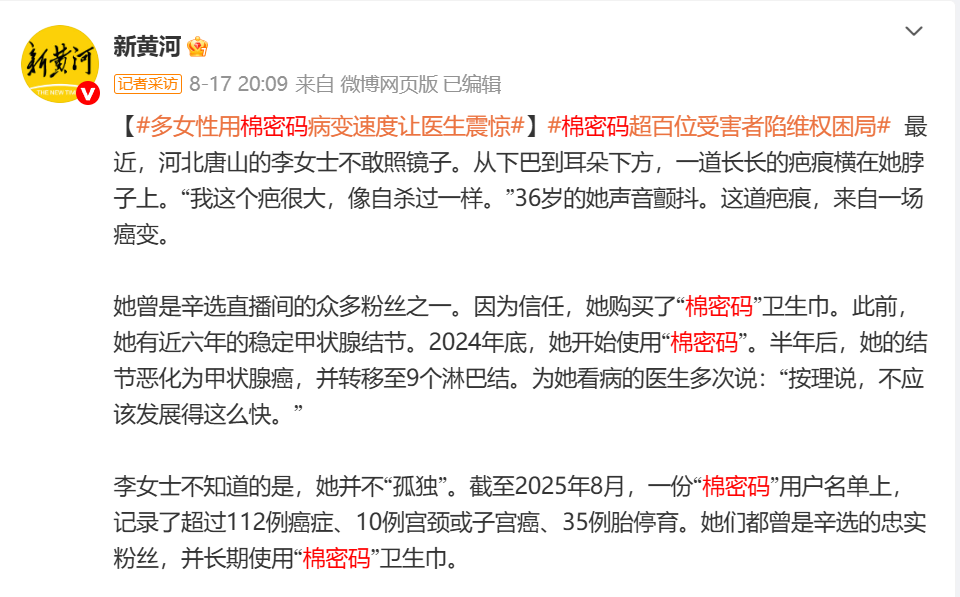 據新黃河報道,多名女性在使用“棉密碼”衞生巾後,癌變速度讓醫生震驚,已經被記錄在案的就有112例癌症,其中10例宮頸或子宮癌,35例胎停育。