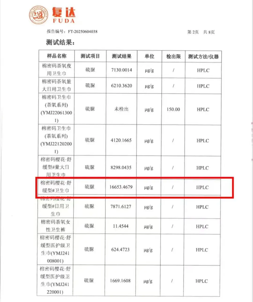 今年5月,自媒體曝光“棉密碼”衞生巾添加硫脲,並組織消費者集體送檢。根據當時的結果,10份樣品中有7份檢出硫脲,最高達到3732.2022μg/g。