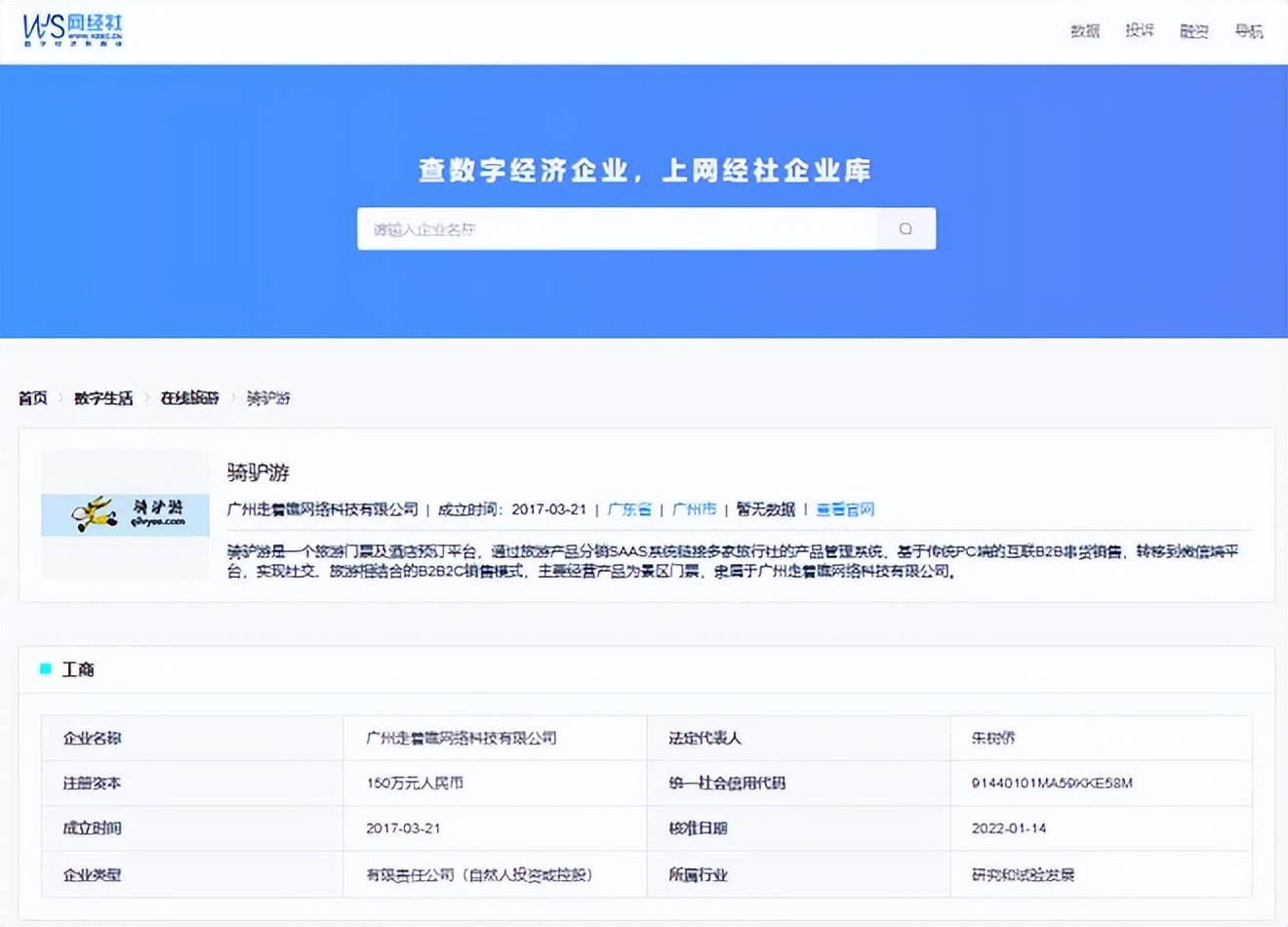 網經社企業庫顯示,“騎驢遊”屬於廣州走着瞧網絡科技有限公司,成立於2017年,法定代表人為朱樹僑。