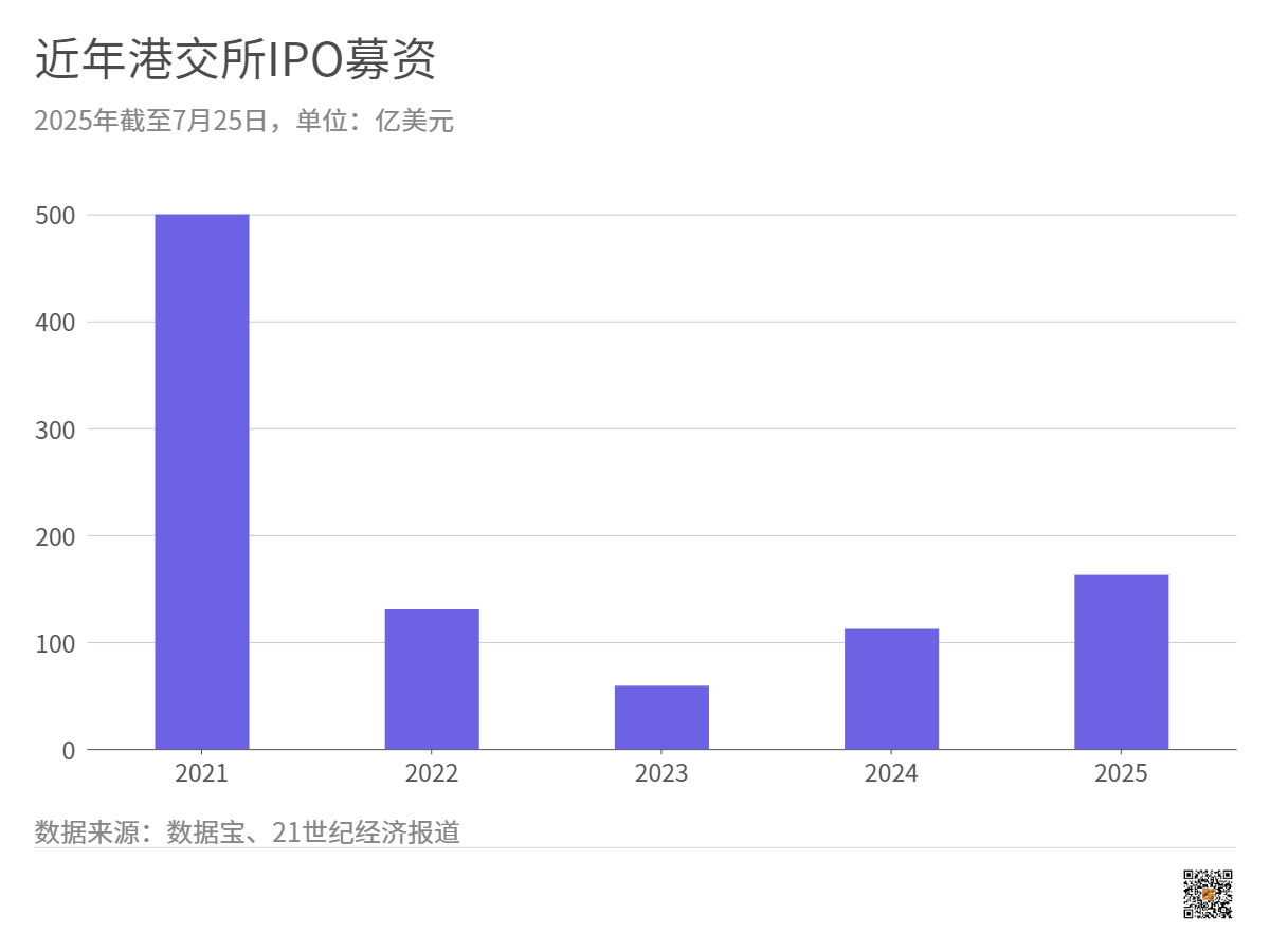 截至7月25日,2025年已有52家公司登陸港股上市,港股IPO首發募集資金已達1273.6億港元(約合162.74億美元),創2021年以來新高。