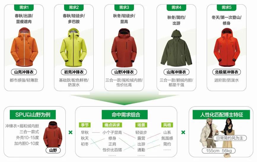 而更深一層的矩陣策略,是從1個大單品到N個大單品,在一個場景下打造N個產品矩陣,深度紮根場景,建立覆蓋面更廣、認知程度更深的品牌心智。像伯希和就從徒步場景的“需求小共識”出發,以巖殼衝鋒衣、山殼衝鋒衣、山野衝鋒衣、山海衝鋒衣等大單品為支點,拓展到防曬衣、羽絨服等品類,實現一個場景下的衝鋒衣大單品產品矩陣。