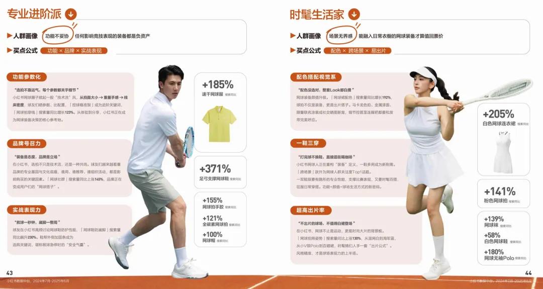 比如今年大火的“紅土網球”場景下,衍生出“專業進階派”、“時髦生活家”等不同的細分受眾——前者關注裝備性能,數據顯示小紅書平台上足弓支撐網球鞋、速幹網球服搜索量同比分別大漲371%、185%;後者追求出片、運動美感,一鞋三穿、網球裙配色成為熱詞,為相應品牌提供了定位目標用户的參考依據。