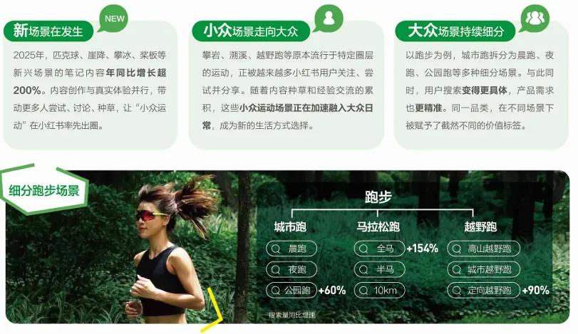 我們看到,**用户的需求正隨着場景的豐富而不斷細分擴容。**以跑步為例,目前“跑步場景”已細化出晨跑、夜跑、公園跑等細分場景,不同的場景又對應出不同的產品需求。而在小紅書,一些小眾場景破圈,攀巖、溯溪、越野跑等運動受眾面逐步拓寬;新的場景也在不斷湧現,據《白皮書》統計,2025年匹克球、崖降、攀冰、槳板等新興場景筆記內容同比增長超200%。