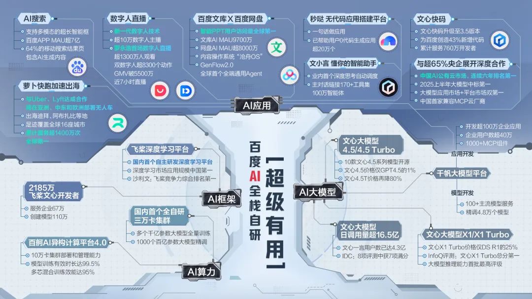 百度的AI商業化之所以能夠率先跑出拐點,根本原因在於其在過去十年持續構建的全棧AI能力體系。不同於大多數廠商側重模型性能或單點解決方案,百度從底層芯片到上層平台與應用,完成了全鏈路自研和優化;這種結構性佈局,正在成為百度穿越週期的技術槓桿。