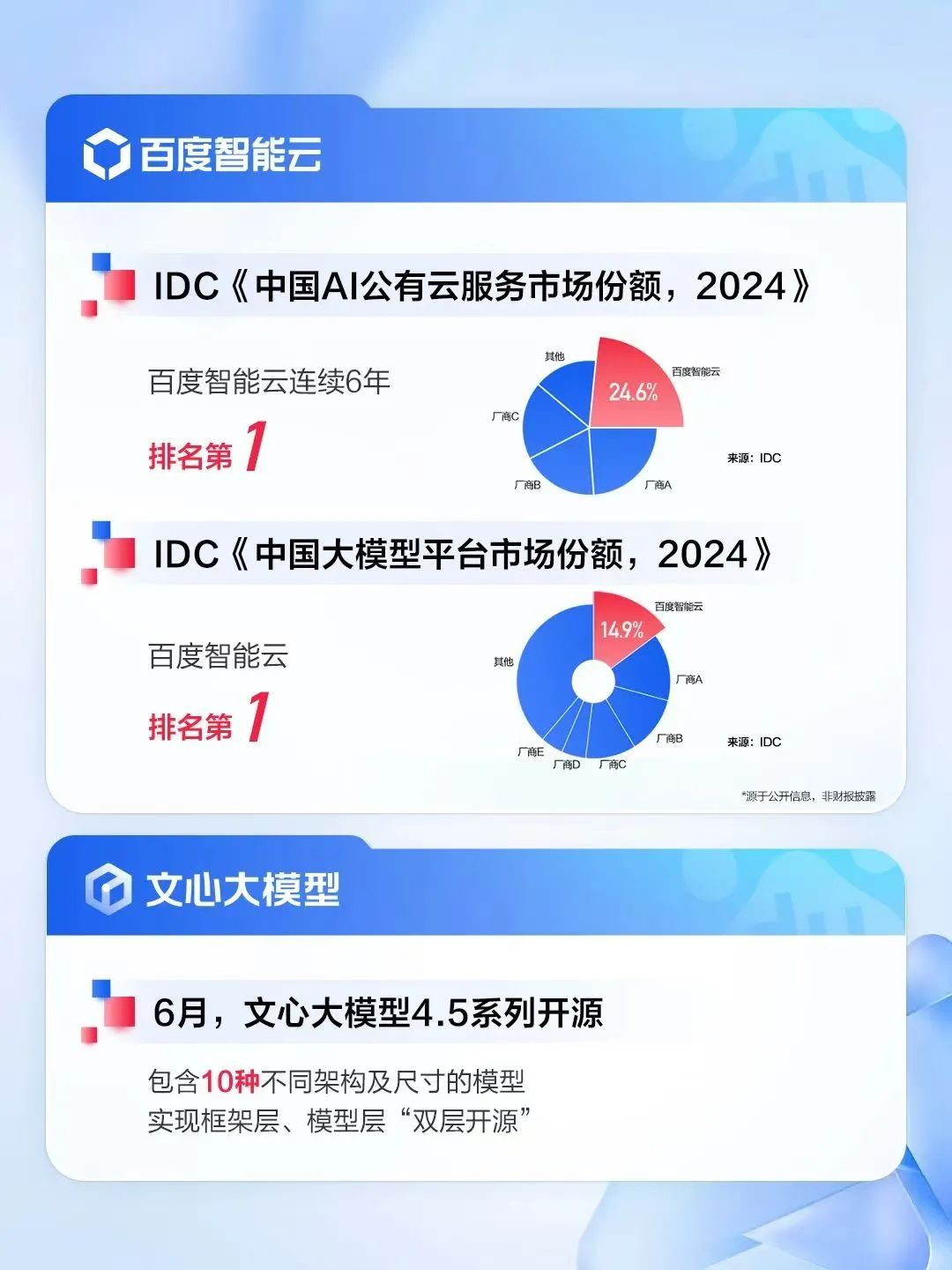 IDC數據顯示,百度智能雲已連續六年位居中國公有云市場份額第一,在大模型平台市場、應用市場均保持行業領先。最新金融行業報告顯示,百度智能雲在中國金融生成式AI平台與應用領域以12.2%的份額穩居第一,服務招商銀行等頭部客户,推動智能客服、多模態分析等核心場景的模型落地。