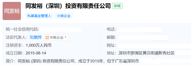 天眼查顯示,同發裕成立於2015年8月14日,註冊資本1000萬元,法定代表人劉景燁。後者也是同發裕實控人,持有40%股權。