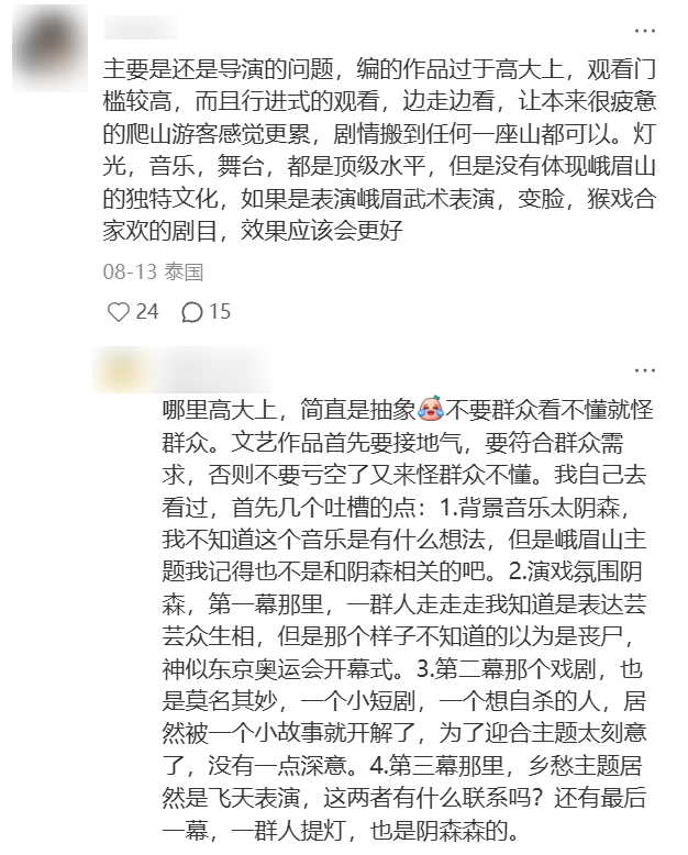 還有網友認為,在峨眉山做行進式觀演形式就有點不太搭,來景區的遊客必定要爬山,演出還是在晚上,白天已經消耗了很大精力,看演出還要邊走邊看,一走好幾個小時,全程沒什麼互動只是看,體驗感就受影響。
