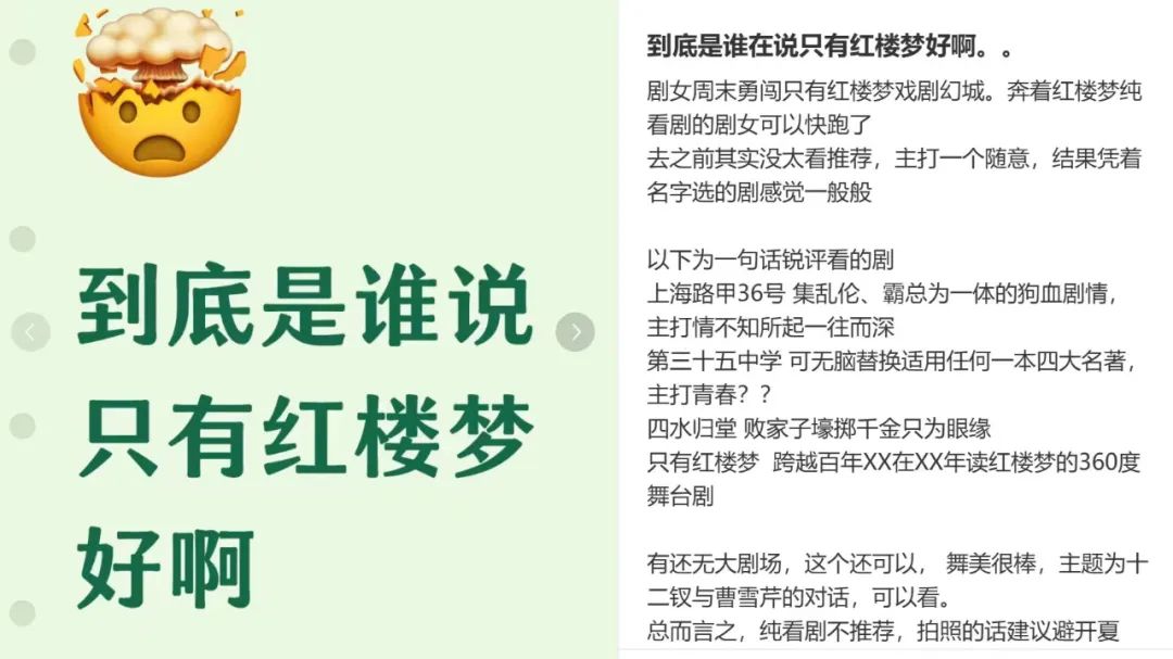 去過的觀眾對於這裏場景建造以及出片效果評價非常高,斥巨資打造的劇場至少對眼睛非常友好,但涉及到不同劇場表演的劇目,評價也是五花八門。有誇讚演員演技好,互動感更強的,也有看不明白劇情,甚至對劇場所講故事傳遞價值觀有質疑的。