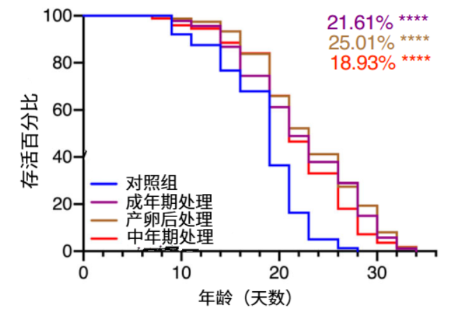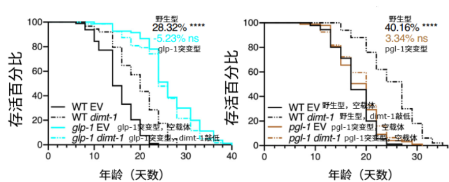 具體來説,如果只在線蟲出生到成年早期這段時間短暫地敲低DIMT-1,之後再恢復它的表達,線蟲的壽命並不會延長。但如果在線蟲成年、產卵結束(生完孩子後)甚至中年階段敲低DIMT-1,卻能延長約19%-25%的壽命。