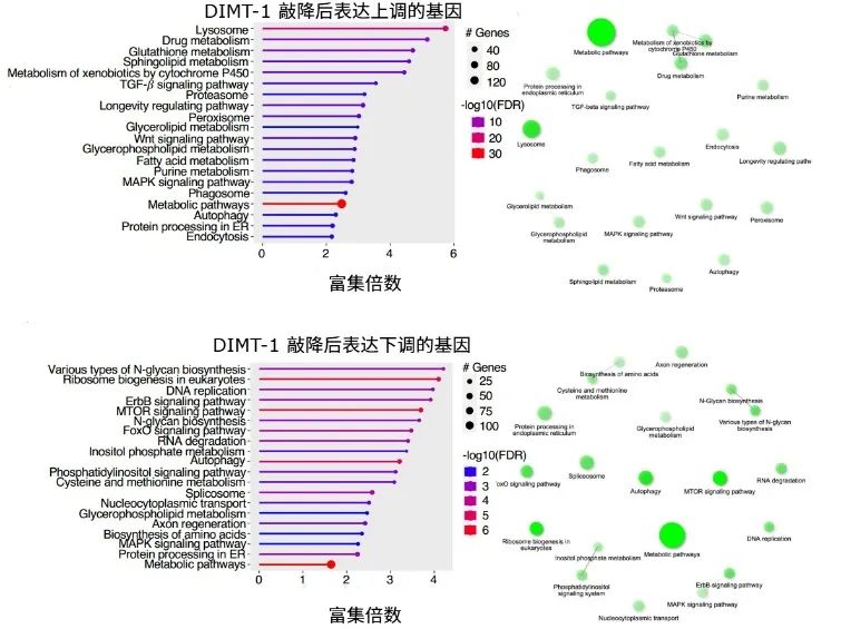 圖注:與對照相比,DIMT-1被敲低的線蟲中,相關通路的變化