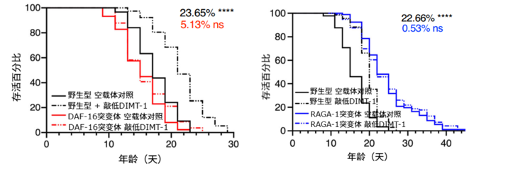 圖注:在DAF-16和RAGA-1突變線蟲中敲低DIMT-1後延壽效果也會減弱或者消失
