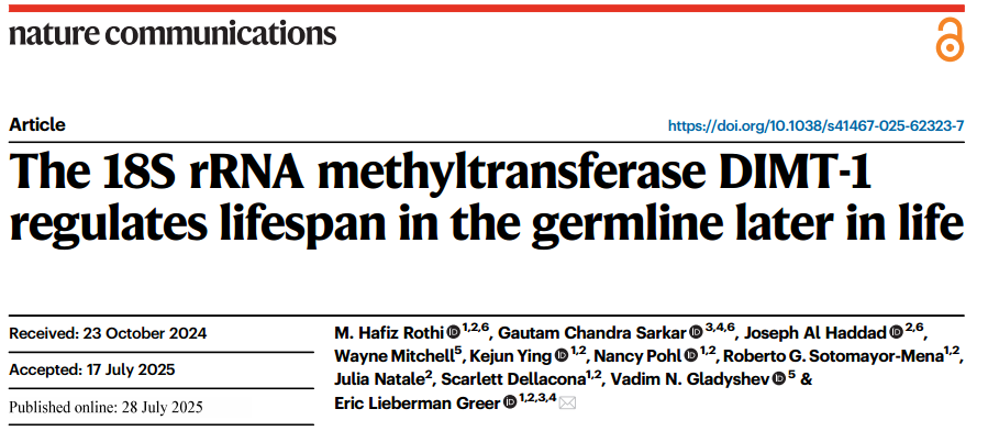 [4] Rothi, M. H., Haddad, J. A., Sarkar, G. C., Mitchell, W., Ying, K., Pohl, N., Sotomayor, R., Natale, J., Dellacono, S., Gladyshev, V. N., & Greer, E. L. (2024). The 18S rRNA Methyltransferase DIMT-1 Regulates Lifespan in the Germline Later in Life. Research square, rs.3.rs-4421268.