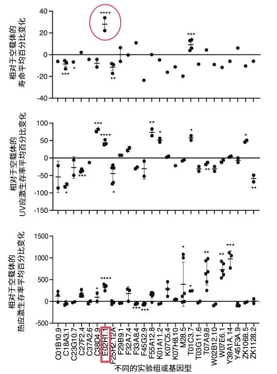 圖注:敲低不同核糖體RNA甲基轉移酶基因對線蟲壽命,及其對抗紫外線和熱應激的影響(PS:E02H1.1是DIMT-1基因在線蟲中的基因名稱)