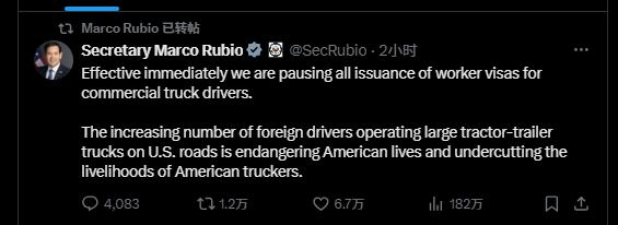 此外,美國國務卿魯比奧週四也在社交媒體平台X上發帖稱,美國還將停止向商業卡車司機發放工作簽證。他表示,這一變化立即生效。