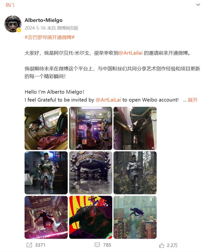 去年《愛死機》系列中的《證人》《吉巴羅》導演Alberto Mielgo受邀入駐微博,更新頻率並不高,但微博熱搜、媒體專訪都沒落下。