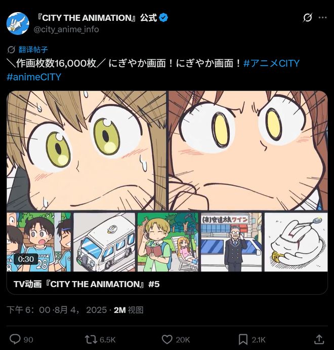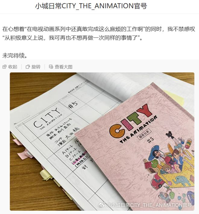 微博的動漫KOL轉發的視頻,以及“小城日常CITY_THE_ANIMATION官號”的內容發佈,都得到了動畫愛好者的回應。官方透露為實現該集創意,作畫數達16000張,粉絲驚訝連連。此外,官方發佈“劇本合宿”的經歷,以及單集製作的細節,動畫製作的幕後故事顯然也是粉絲愛看的。