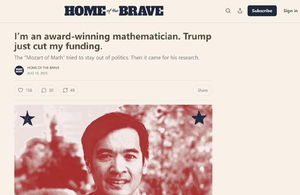 近日,菲爾茲獎得主、加州大學洛杉磯分校(UCLA)數學家陶哲軒在Home of the Brave 平台發文,罕見公開批評特朗普政府對美國科研體系的粗暴干預。他以自身經歷為例,記錄了一場正發生在科研前線的系統性“肢解”。
