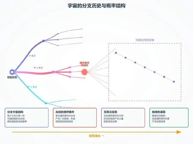 但是,這種產生大量互算法信息的情況,與我們已説到的規律完全相符。因此,隨着宇宙歷史中時間的推移以及事件(伴隨着各種結果的概率)的不斷積累,凍結的偶然事件也隨之積累,從而產生規律。