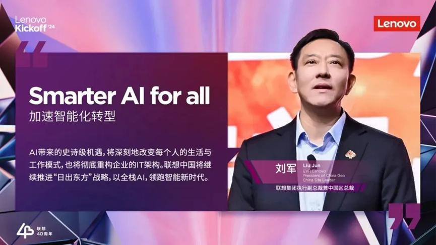 近年來,眼看着AI技術日趨火熱,聯想致力於褪去PC製造商“底色”,向AI創新企業轉型。2025年4月舉辦的2024/2025財年誓師大會上,聯想執行副總裁兼中國區總裁劉軍對外表示,“在全棧AI,加速3S轉型方面,我們將落地做深做透’AI內嵌的智能終端’‘AI導向的基礎設施’和’AI原生的方案服務’。”