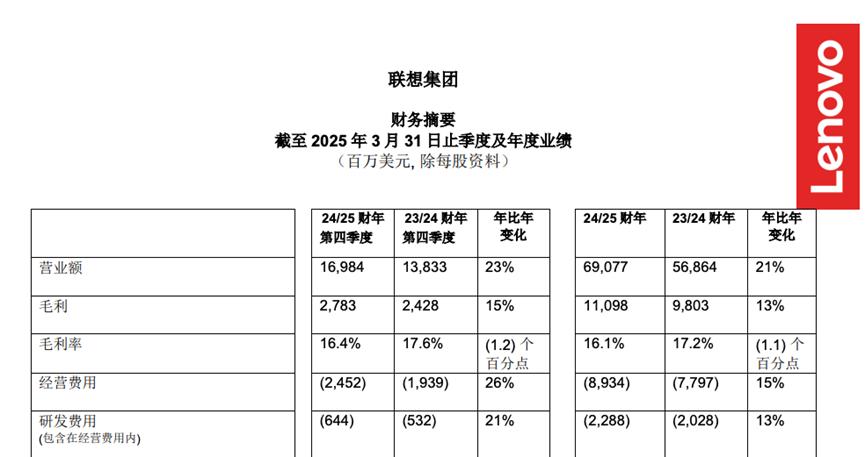 2025年8月14日,聯想披露了2025/26財年Q1(截至2025年6月30日)財報,營收188.3億美元,同比增長22%;非香港財務報告準則下淨利潤3.89億美元,同比增長22%。