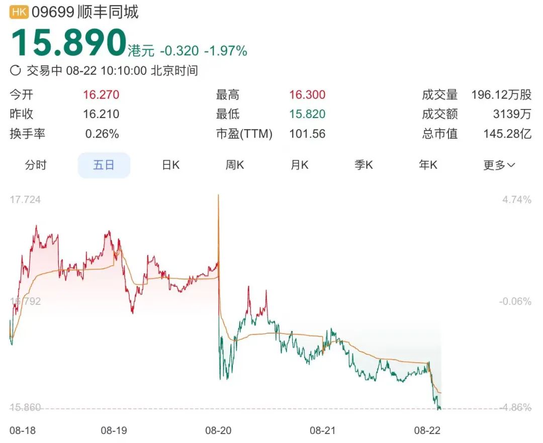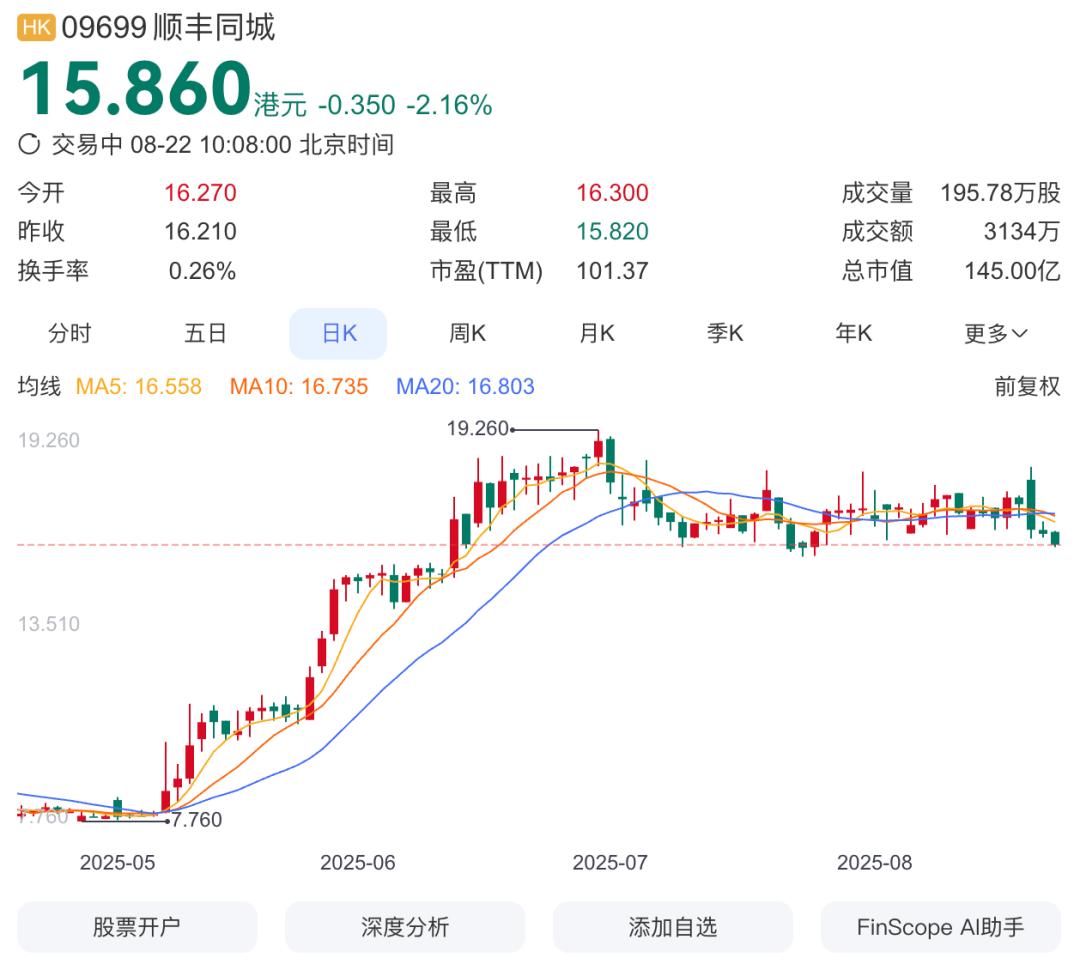 截至2025年8月22日發稿,順豐同城股價約為16港元/股,相較兩個月前19.26港元/股的高點縮水約17%,已然邁入了下行通道。