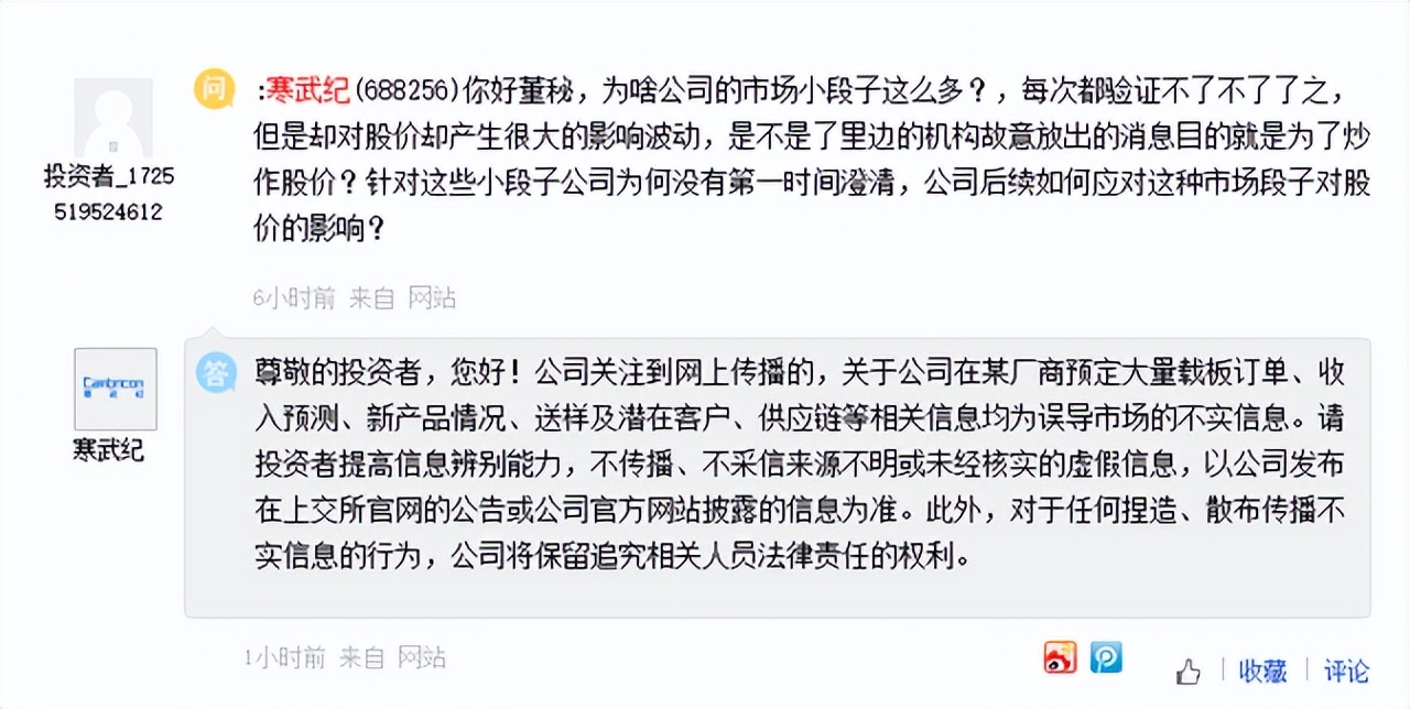 面對這種近乎癲狂的行情,寒武紀在12日晚緊急回應稱,公司關注到網上傳播的關於公司在某廠商預定大量載板訂單、收入預測、新產品情況、送樣及潛在客户、供應鏈等相關信息均為不實消息;之後在14日晚再次闢謠併發布風險提示。