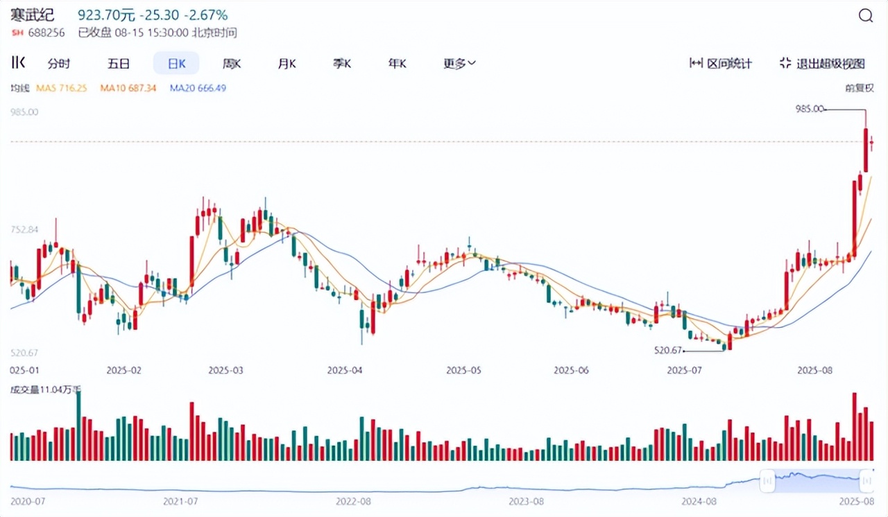 8月12日,寒武紀股價以20%漲停收盤,報848.88元/股,市值一度衝至3551億元,成交額高達151億元;此後兩個交易日繼續封板,8月14日盤中股價最高達985元/股,總市值一度突破4000億元;直到8月15日股價才有所回落,報收923.7元/股,市值3864億元。寒武紀年內漲幅一度突破44%,被網友戲稱為“寒王歸來”。