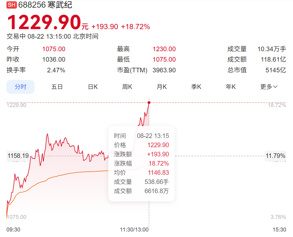 8月22日中午收盤,寒武紀股價報1164.45元/股,總市值4871億元;午後開盤大漲,截至發稿,報1229.90元/股,總市值5145億元,成為A股半導體板塊當之無愧的“寒王”。這一輪暴漲,不僅點燃了整個AI芯片賽道的市場熱情,也迅速引發了輿論與市場的熱議。