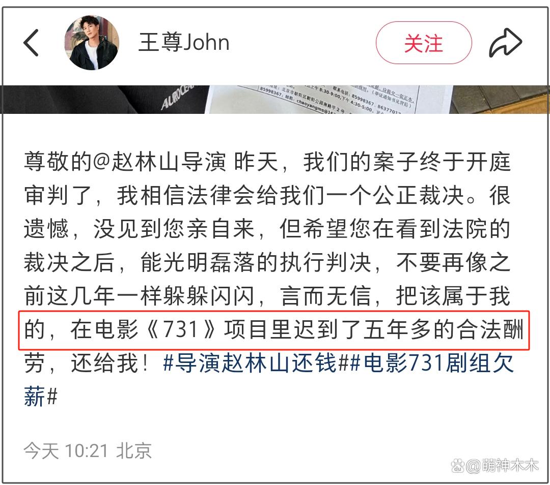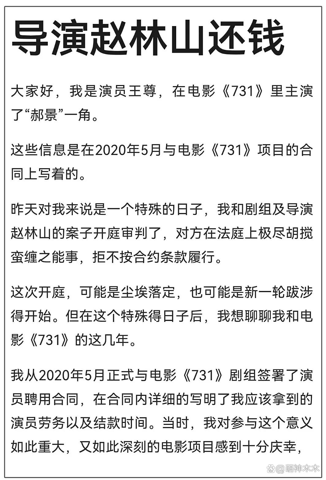 電影《731》官宣定檔後,麻煩又來了!演員王尊控訴劇組拖欠工資,曬起訴書喊話導演趙林山還錢,並曬了大量與導演趙林山和主演温碧霞等合影照片,引發熱議。