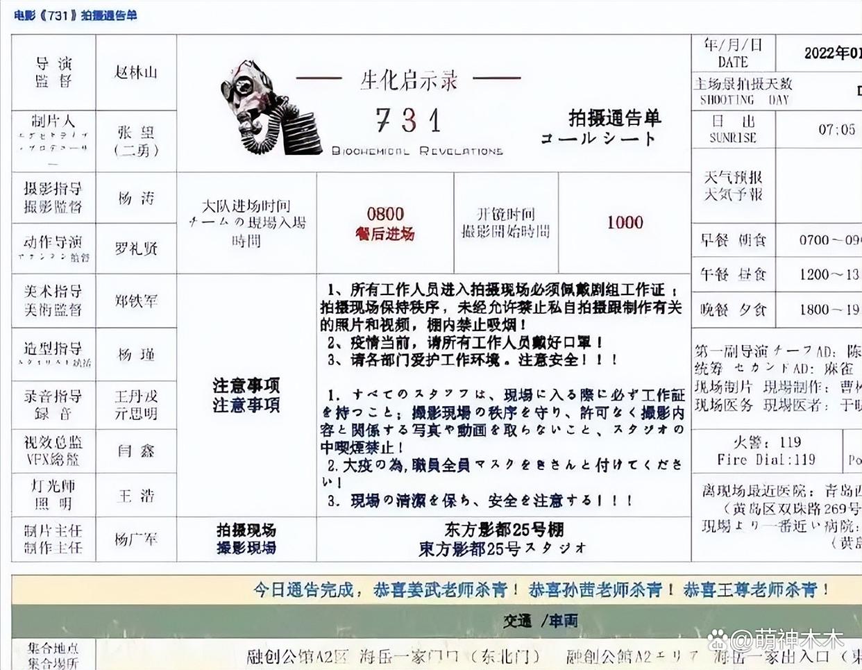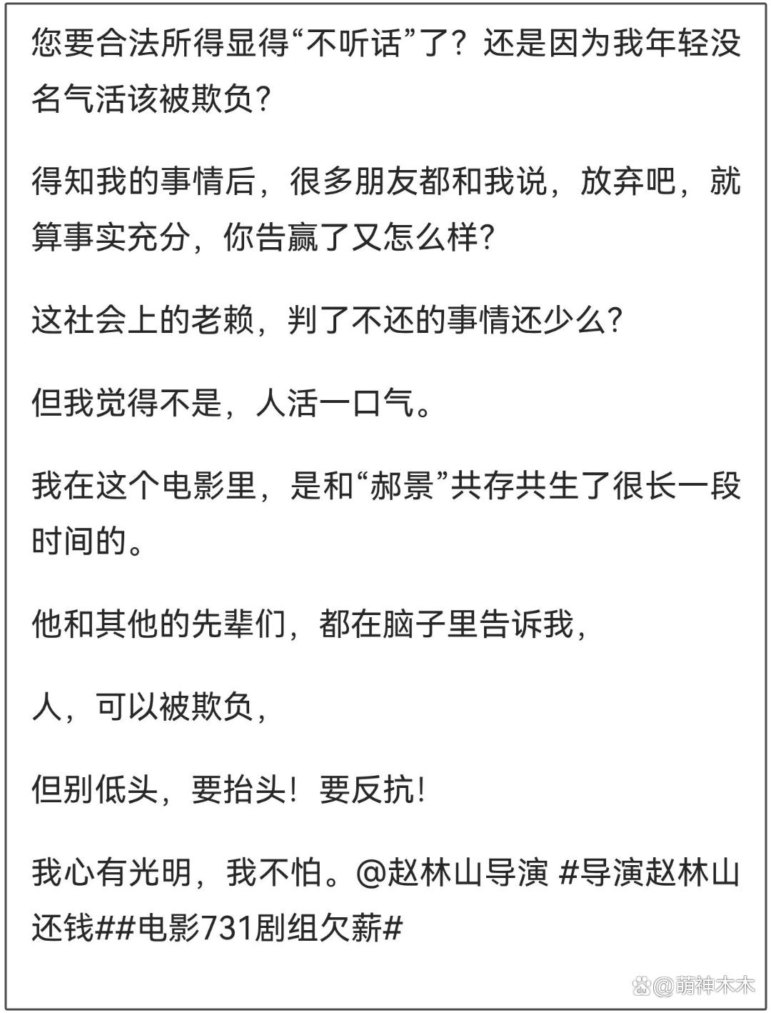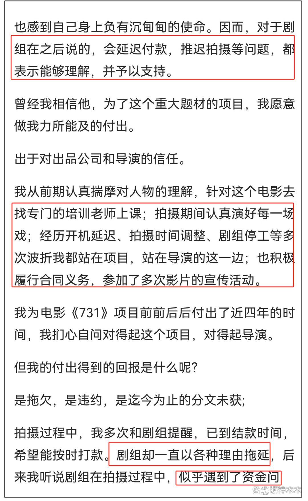 他表示自己為了《731》這部電影耗費了四五年時間,不僅自己請專業的培訓老師,為了電影陪着劇組一起經歷了開機延遲、停工等波折,也積極配合宣傳,甚至因為電影主題,也理解劇組延遲付款、推遲拍攝等行為。每每詢問結款,劇組總是以各種理由推諉,而當自己聽到劇組資金出問題礙於信任也沒追究根本。從曬出的通告單來看,他在電影早期的名字《生化啓示錄》的時候就進組了。