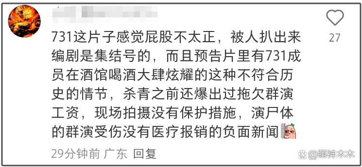 看到《731》劇組欠薪,有網友表示電影問題頗多,不止編劇歪屁股,殺青之前就被曝過拖欠羣演工資,現場拍攝沒有保護措施,演屍體的羣演受傷沒有醫療保險等負面新聞。