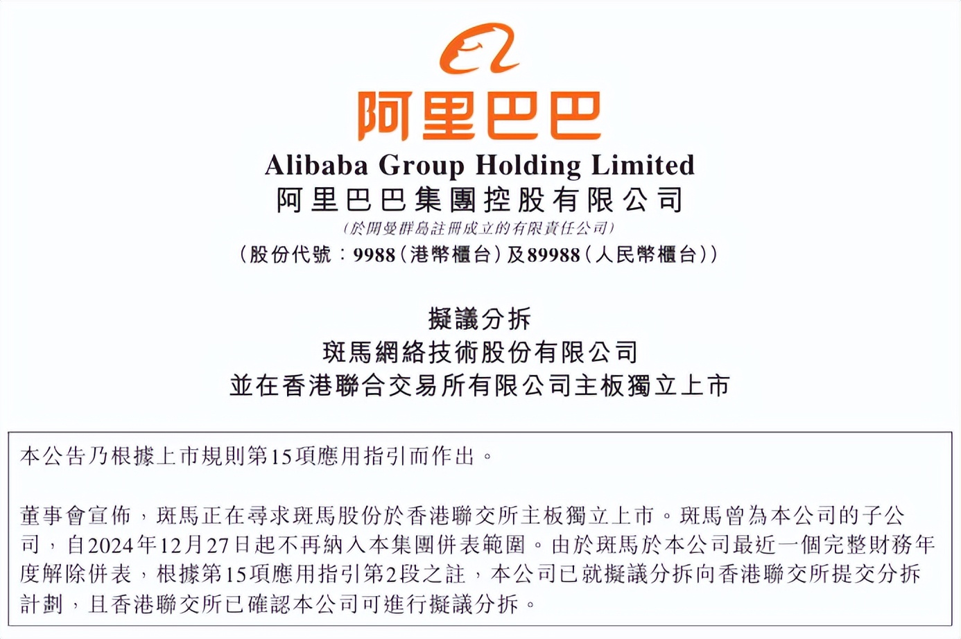 公告顯示,自2024年12月27日起斑馬網絡已不再納入阿里並表範圍。截至公告日期,阿里持有斑馬網絡約44.72%的股份;在通過全球發售股份的方式進行分拆後,阿里仍將持股超30%。