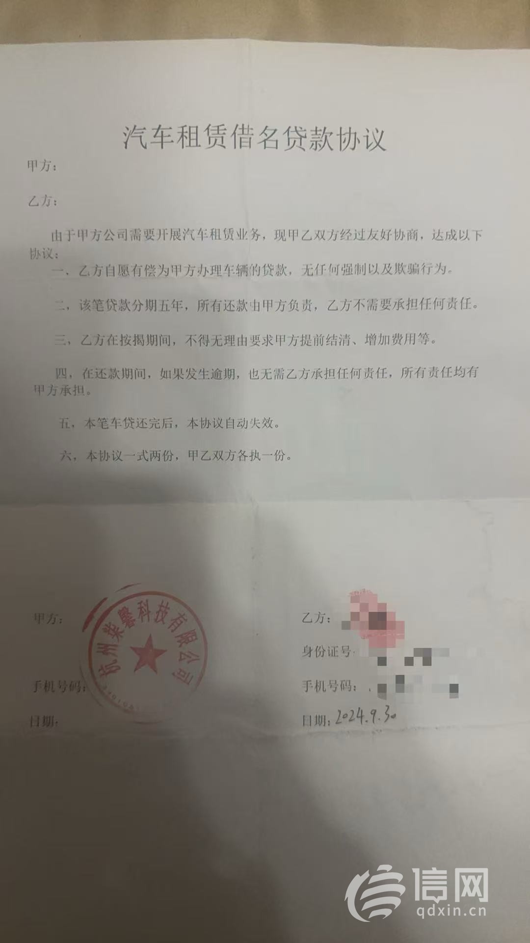 “協議是我去他們公司籤的,辦公室是在個大寫字樓裏,有200多平方米。我去的時候有五六個人上班,説其他人都出去跑業務了。”鄭先生説,自己籤的是一份“汽車租賃借名貸款”協議,雙方約定首付和貸款都由柒馨科技出,鄭先生不需要承擔任何責任,而且還能獲得4000元的報酬。