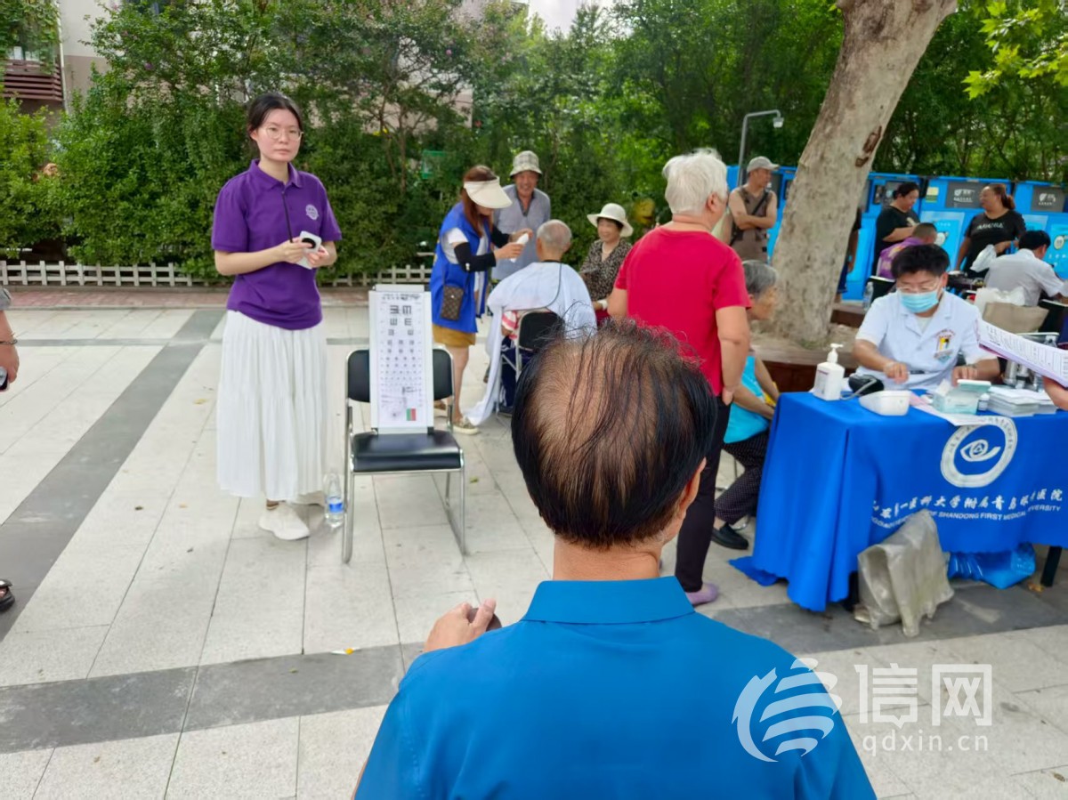 在活動現場,記者還看到四位大學生志願者,充滿青春氣息的他們正在現場為社區居民檢查視力。來自山東第一醫科大學(山東省醫學科學院)的學生們利用暑期時間也加入了志願服務活動中。他們耐心引導居民檢查裸眼視力,並詳細記錄數據,結合檢查結果,為老年人解讀白內障、青光眼的早期症狀,提醒視力模糊的居民及時就醫。