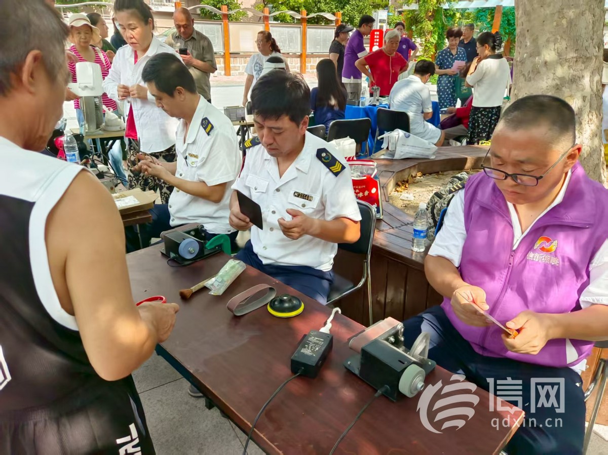 剛結束一波磨刀小高潮的王振雷來自市北巴士第五分公司青島巴士志願團,只見他稍作休息和調整,利用空餘時間,他清理着桌子上的粉末,並更換了機器上的砂紙,收拾完成後等待居民的前來。記者看到,除了桌子上的磨刀設備,王振雷還準備了一些清水和小刷子,仔細一問,原來,刀具在打磨過程中摩擦生熱,加上室外温度本就頗高,每打磨完一把,他都會將刀具放到涼水中“降温”並清洗,一個小小的細節不難看出志願者的用心和認真。